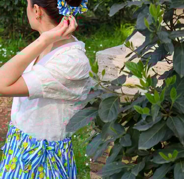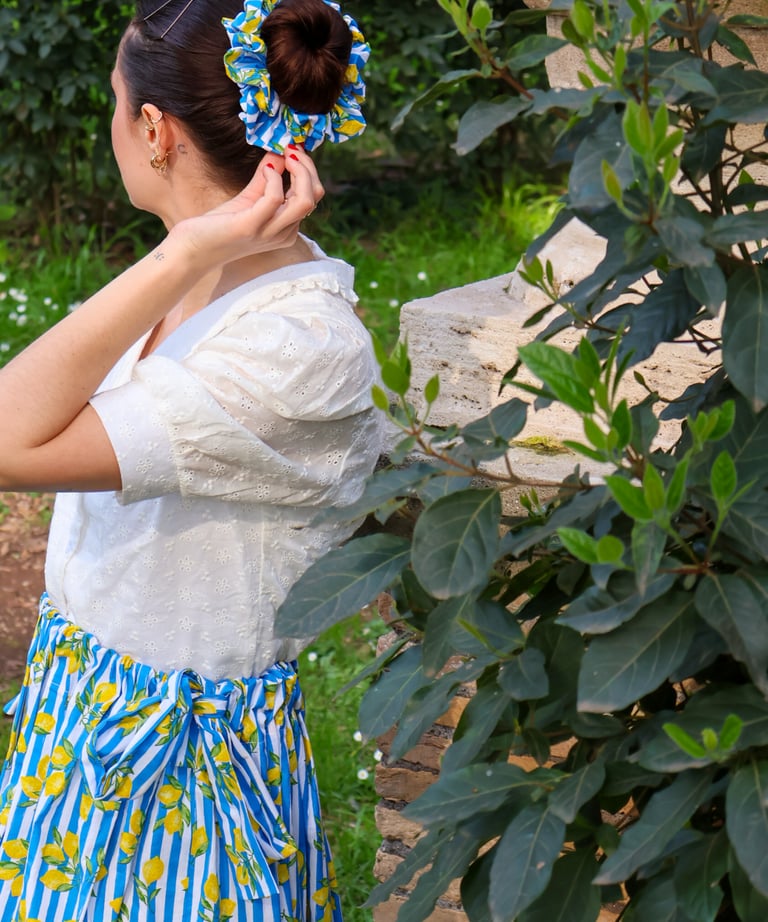J'ai décidé de la faire dans un tissu léger au tombé droit avec son joli imprimé rayé bleu et blanc agrémenté de citrons jaunes vibrants, pour un appel aux beaux jours et au soleil !