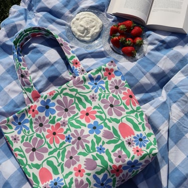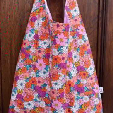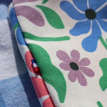 Toujours doublé avec un tissus viscose en vichy rose pour rappelé les fleurs aux couleurs intenses du tissu extérieur, comme un gros bouquet de fleurs printanières.