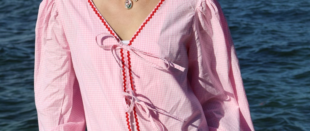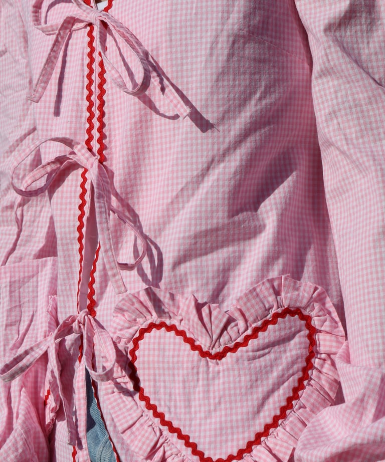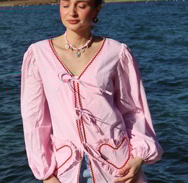 Le chemisier à petits noeuds et manches bouffantes romantique à souhait ! Sans oublier son tissu vichy rose clair avec des finitions rouges qui apporte une touche de contraste au chemisier.