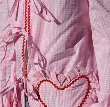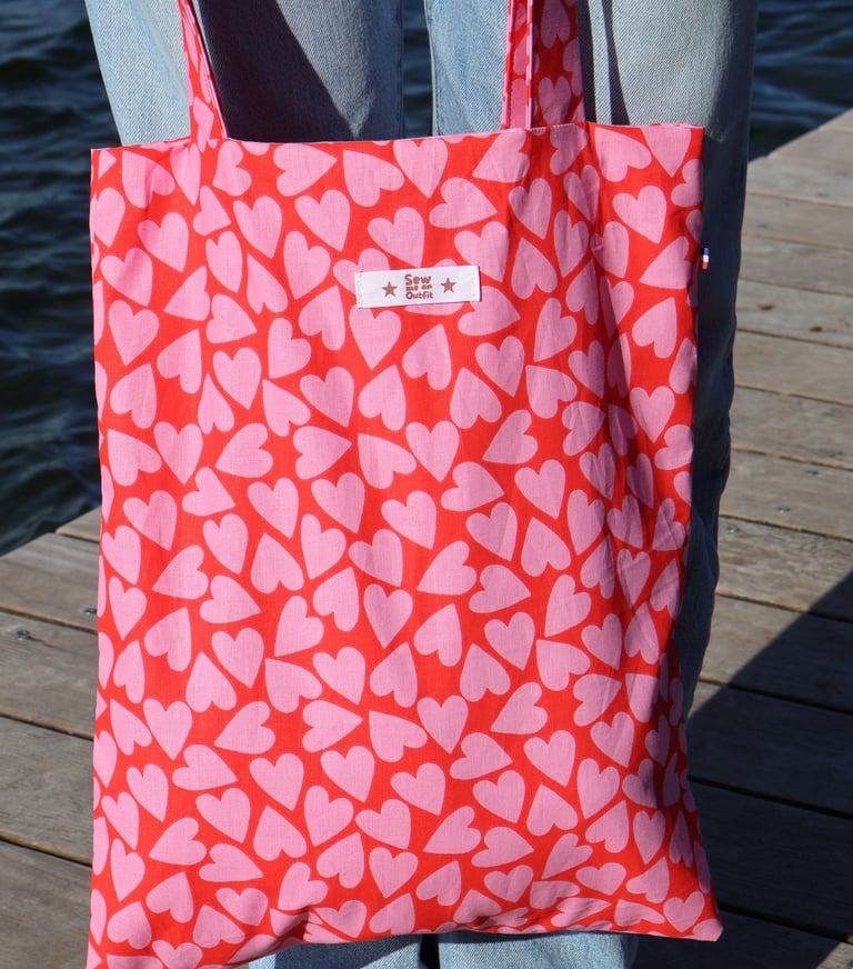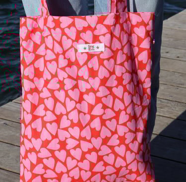 Avec son tissu à petits coeurs rouge et rose, ainsi que sa doublure vichy rose, il ne pouvait pas être plus dans le thème !
